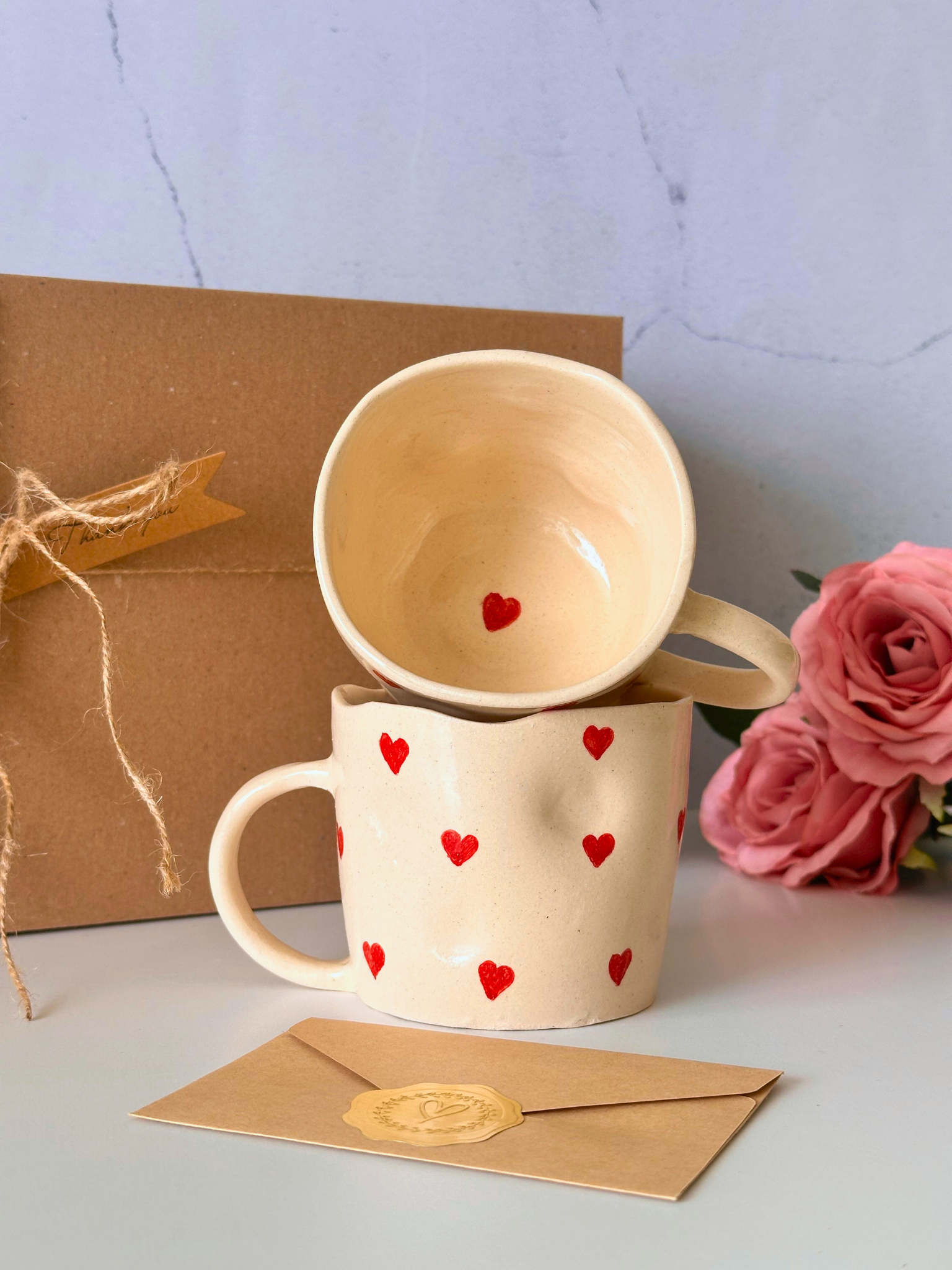 Ръчно изработена керамична чаша (180-200 мл) с нежен дизайн на малки сърчица.